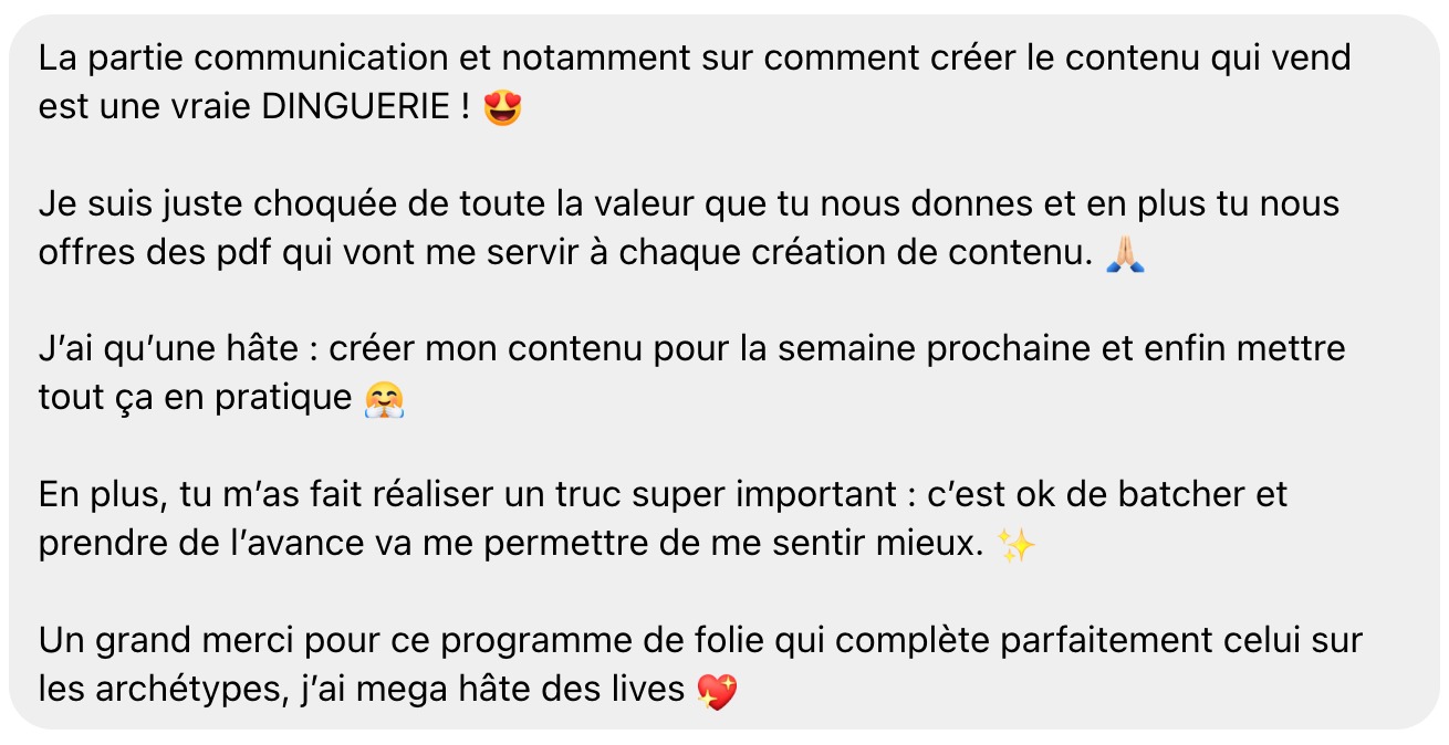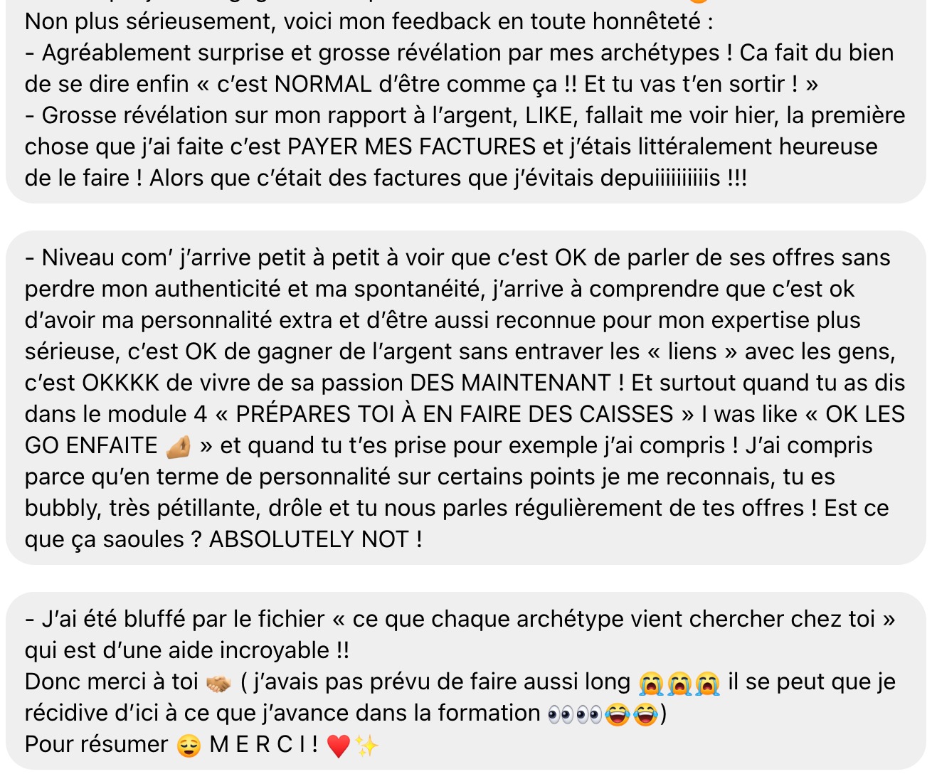 Je suis une éternelle apprenante, je me forme constamment sur les meilleures méthodes de vente et de communication. Dans Archétypes Visibility, tu trouveras tout sans rétention sur le sujet d’attirer des clients prêts à payer grâce à ta communication. En plus si tu as déjà fait le programme Archétypes Monyfestation, sache que le sujet de la communication nous l’avons juste abordé en surface ! Il y a tout un univers à découvrir que j’ai vraiment envie de te partager car communiquer est un des meilleurs moyens d’attirer l’argent dans ton business !